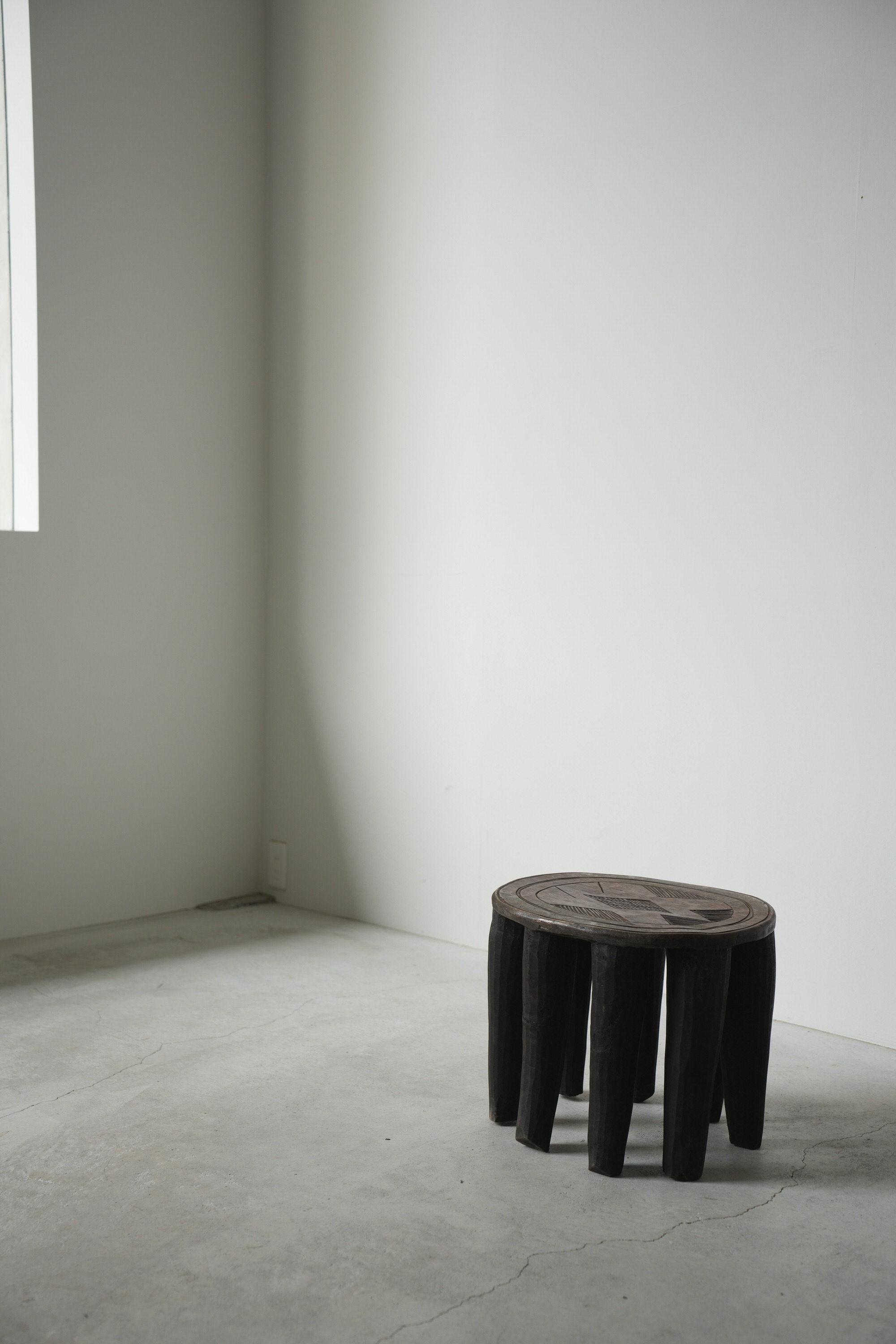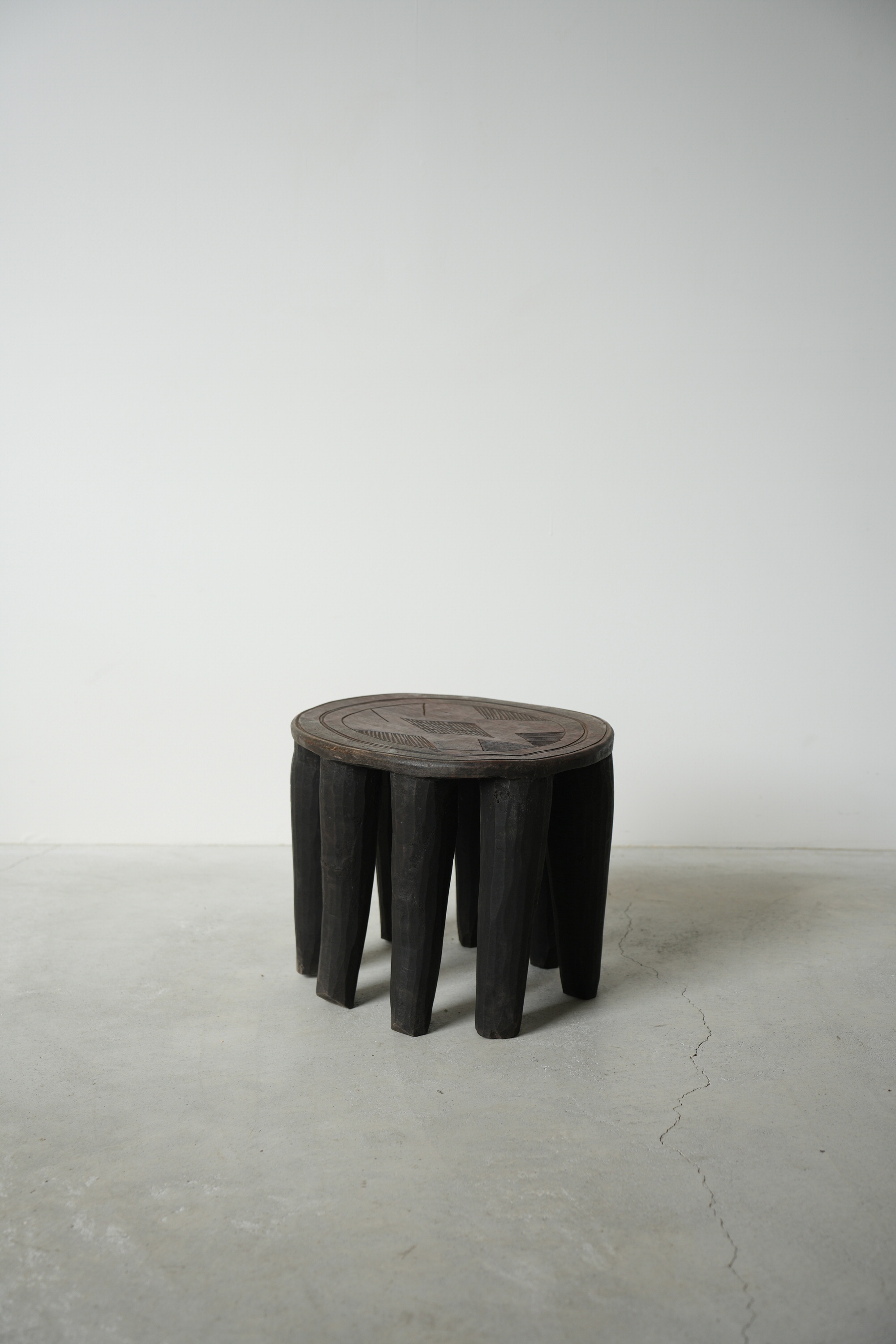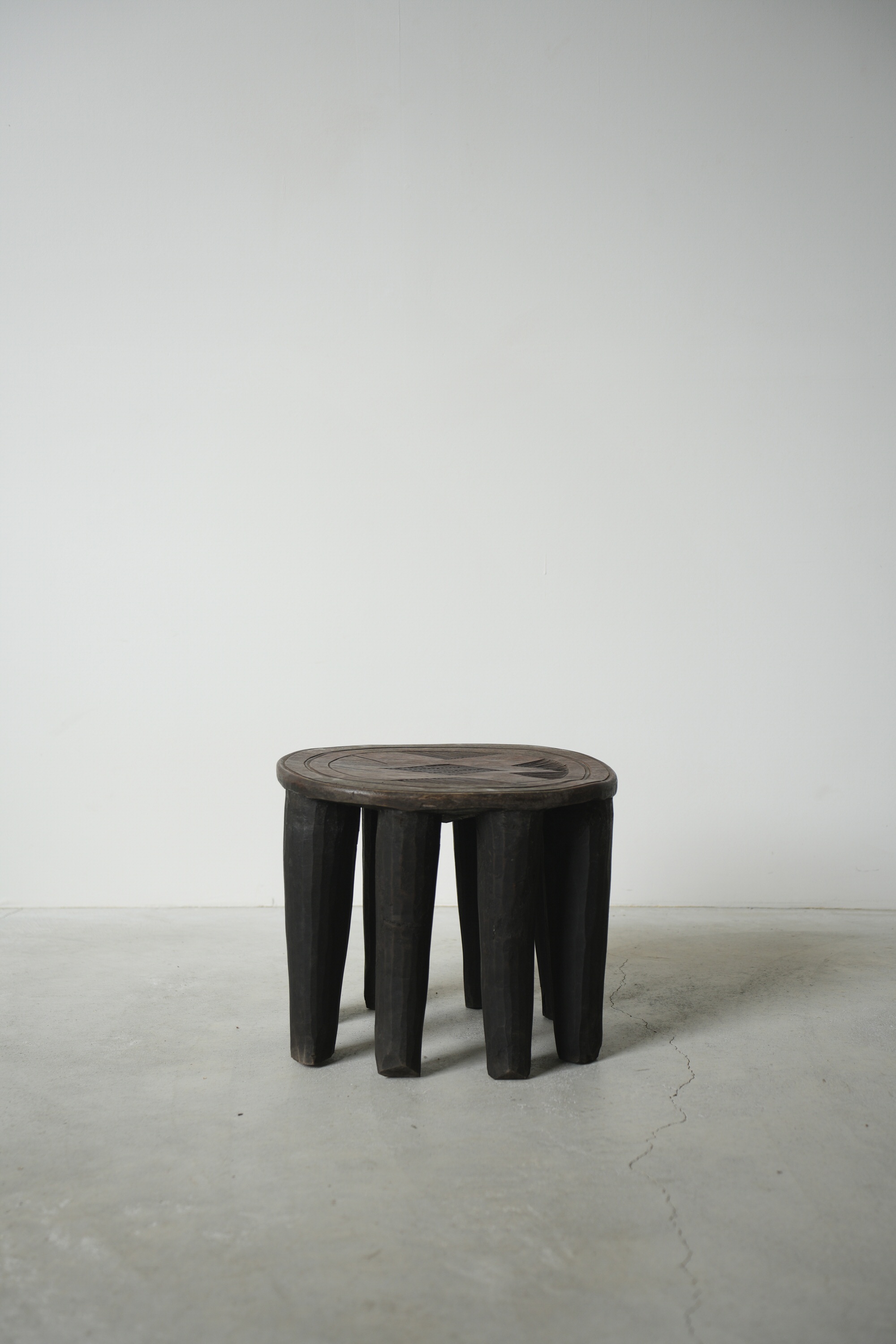 単木から削り出し作られるこのスツールは脚の数や彫りが特徴的で、スツールとしては勿論、サイドテーブルや飾り台、或いはオブジェクトとしてとても魅力的です。