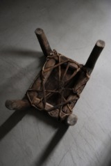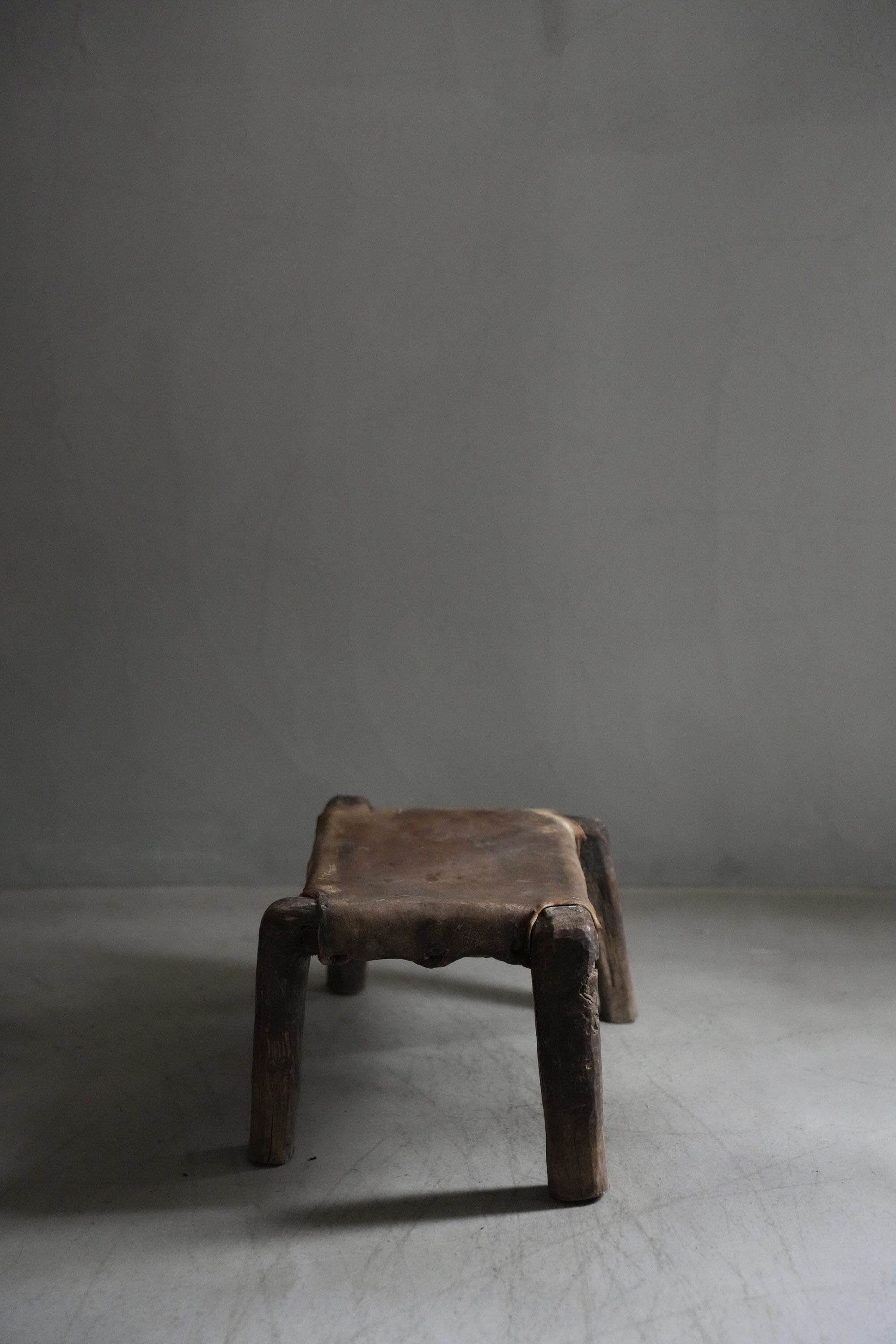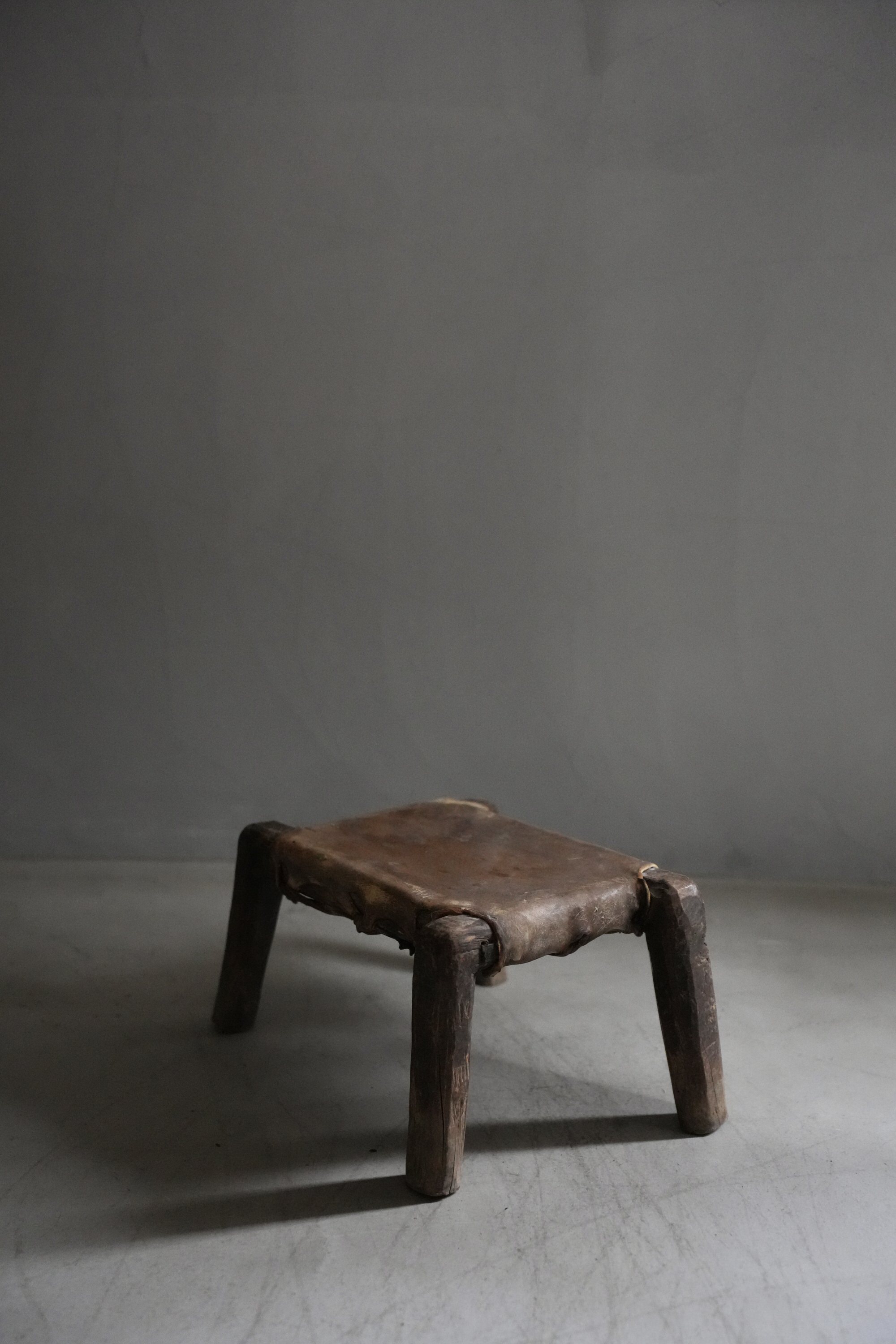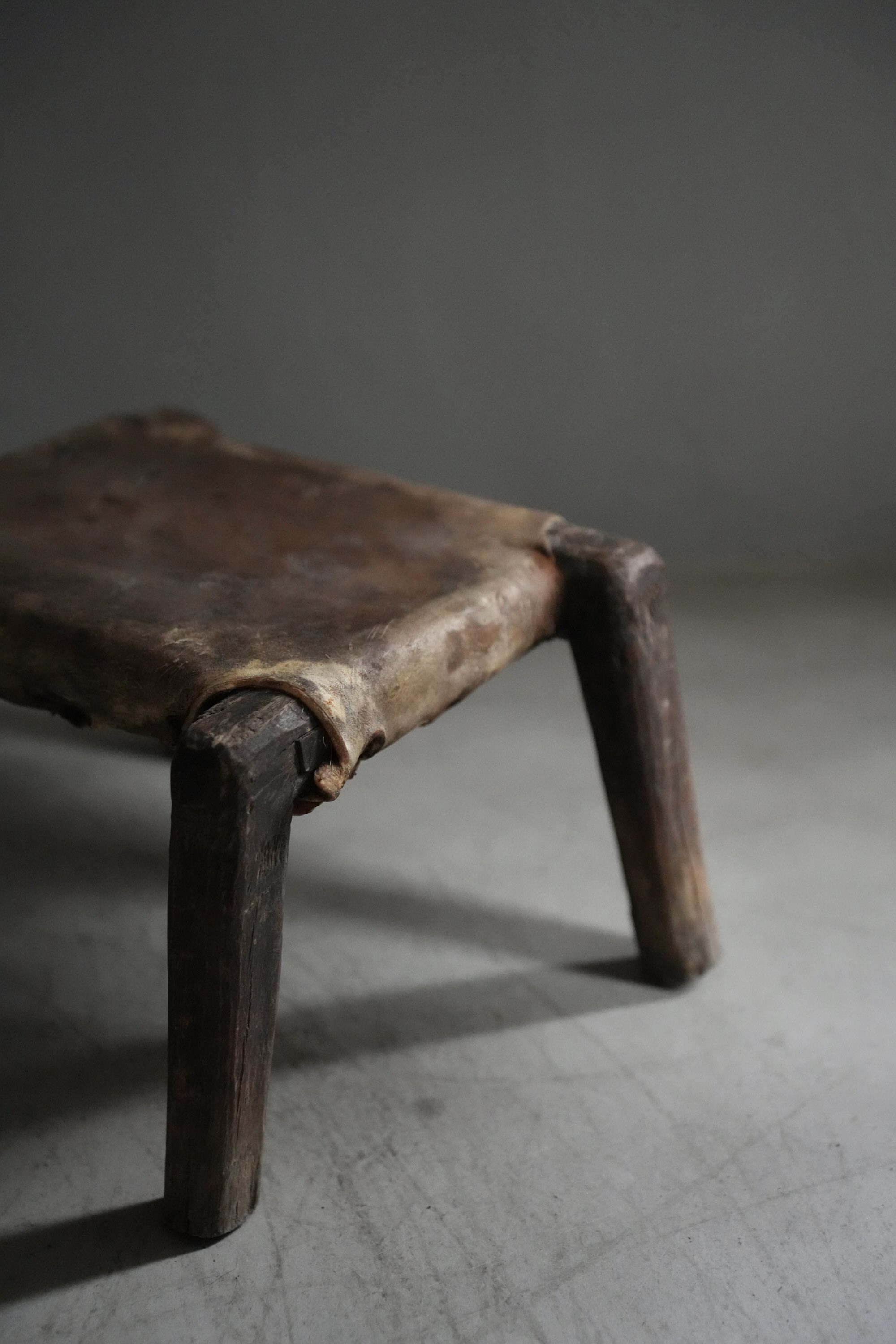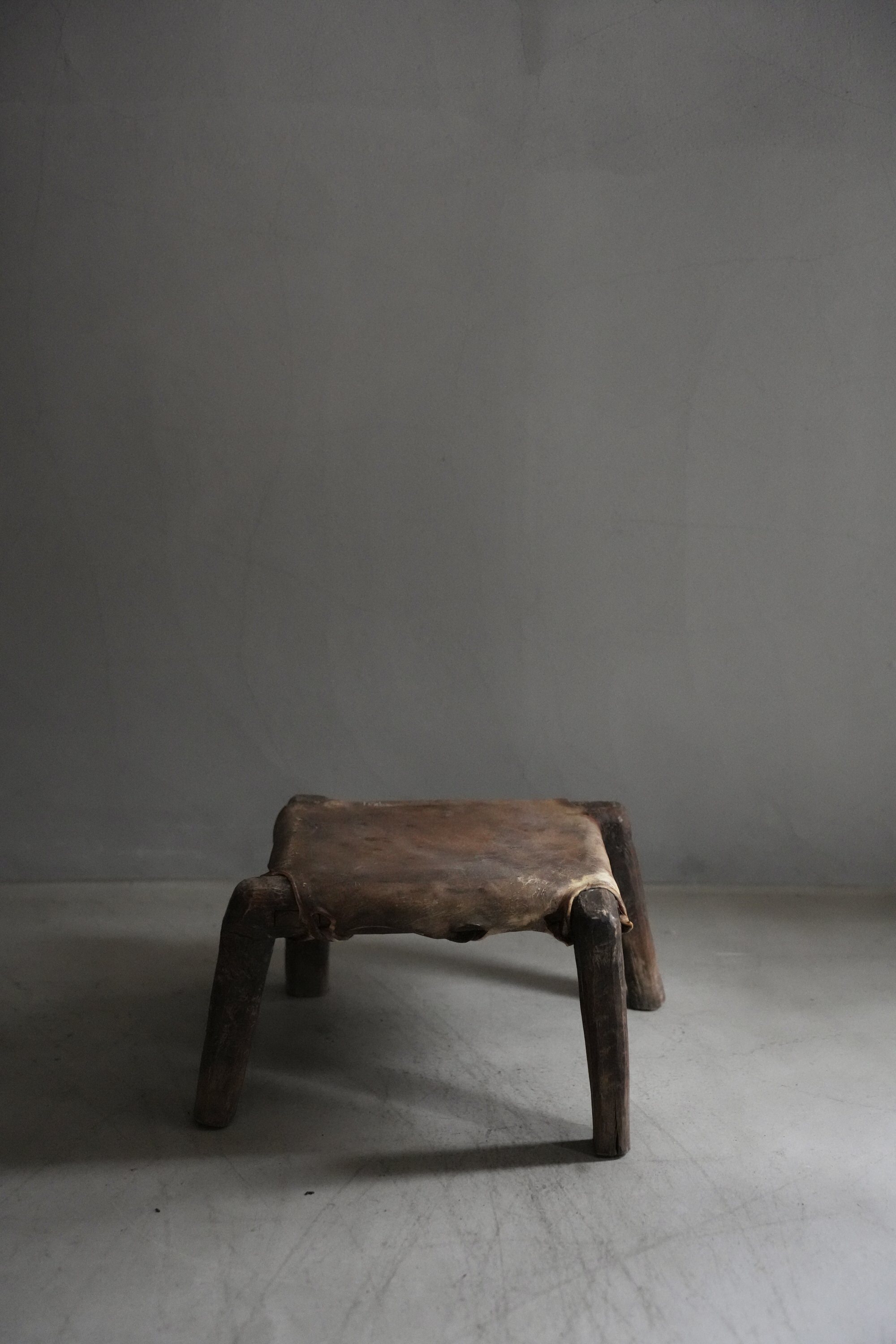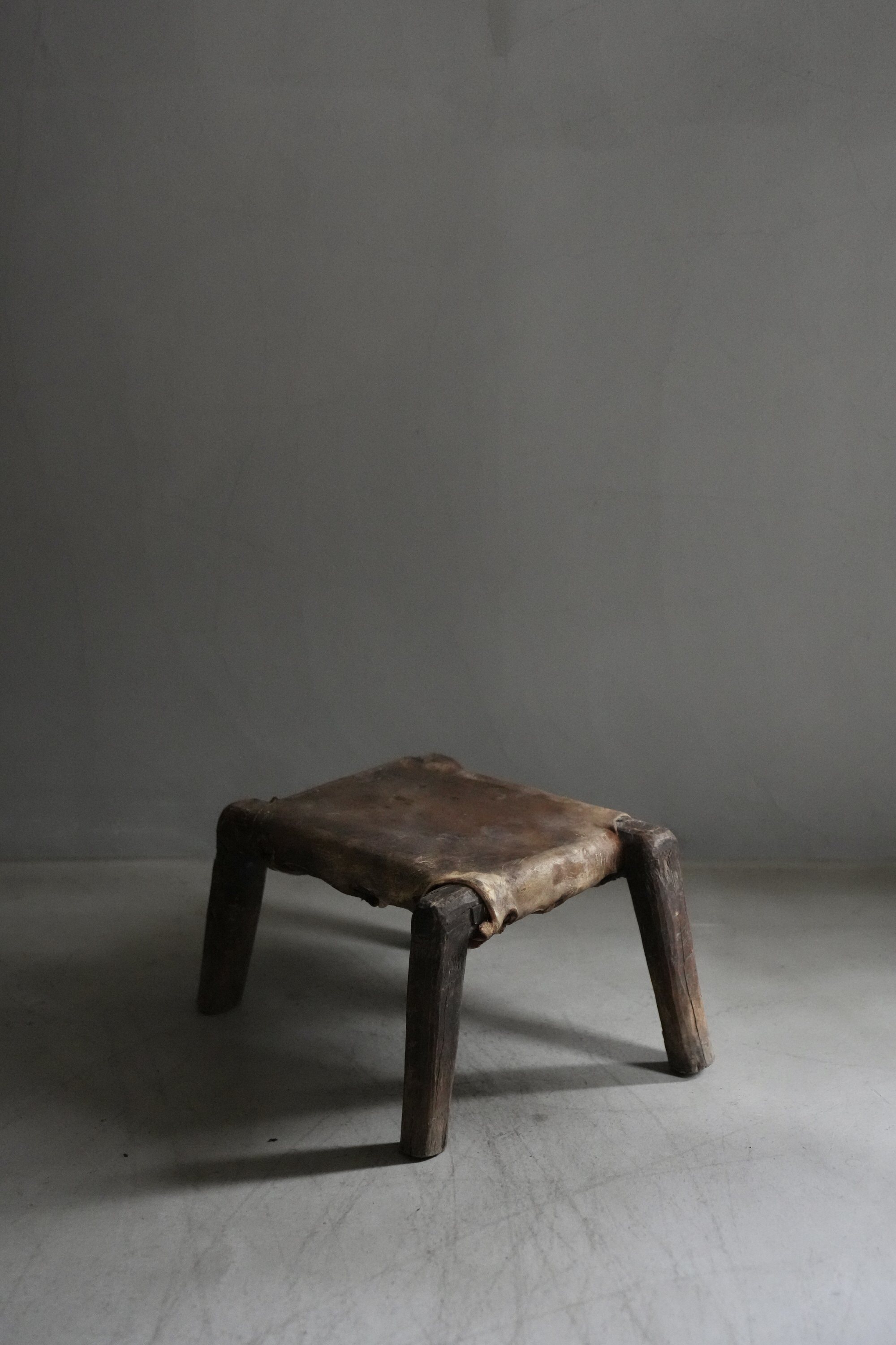 卍のように組まれた脚とレザーの組み合わせで、小ぶりながら存在感があるスツールです。